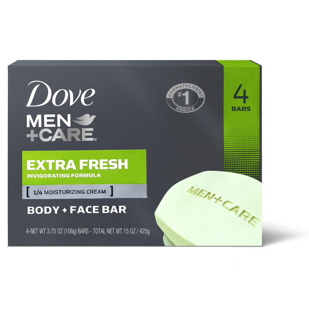 Dove Men+Care Body + Face Bar Invigorating Formula, Extra Fresh, 3.75 oz (4 Bars). Looking for a bar that leaves skin feeling refreshed, hydrated, and invigorated? Dove Men+Care Extra Fresh Body and Face Bar delivers a deep, refreshing clean and hydration. Unlike an ordinary bar soap or body soap that can dry out skin, this bar is formulated with more moisturizer to help maintain skin’s moisture and hydration levels, leaving it feeling healthy, smooth and comfortable.From the dermatologist recommended men’s brand, Dove Men+Care Extra Fresh Body and Face Bar is specifically designed for men to give skin a deep clean, while leaving it hydrated and healthy. This 3 in 1 bar is gentle enough to be used not only for the body, but also as a facial cleanser and shaving product. To use, moisten the body bar with water and work it into a light foam between your hands. Massage onto your face and body before rinsing thoroughly.Dove Men+Care champion active fathers and the need for paid paternity leave. Find out more about their work in celebrating fatherhood and raising awareness around parental leave on the Dove Men+Care site.And as part of our commitment towards sustainability, each Dove Men+Care body and face wash bar is PETA certified Cruelty Free. Each Dove Men+Care body wash bottle is recyclable and made with 100% recycled plastic and is PETA certified Cruelty Free. For adult use.