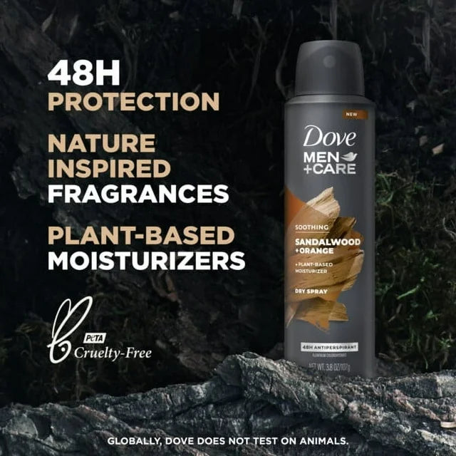 Dove Men+Care Antiperspirant Deodorant Dry Spray, Sandalwood and Orange, If you're looking for an Antiperspirant deodorant for men with long-lasting protection against sweat and odor, look no further. Designed for men on the move, this dry spray deodorant contains plant-based moisturizers and natural essential oils that offer you 48-hour odor protection along with a naturally inspired soothing feel. This spray is tough on odor, but not on the skin. The result is Long-lasting protection that works to keep you feeling soothed and dry for 48 hours. For the most effective protection, give the can a shake before you spray this Antiperspirant on smoothly, let the soothing scent of Sandalwood and Orange give you the protection that works against sweat and odor. You can also rest assured that this Antiperspirant is cruelty-free, as part of Dove global mission.