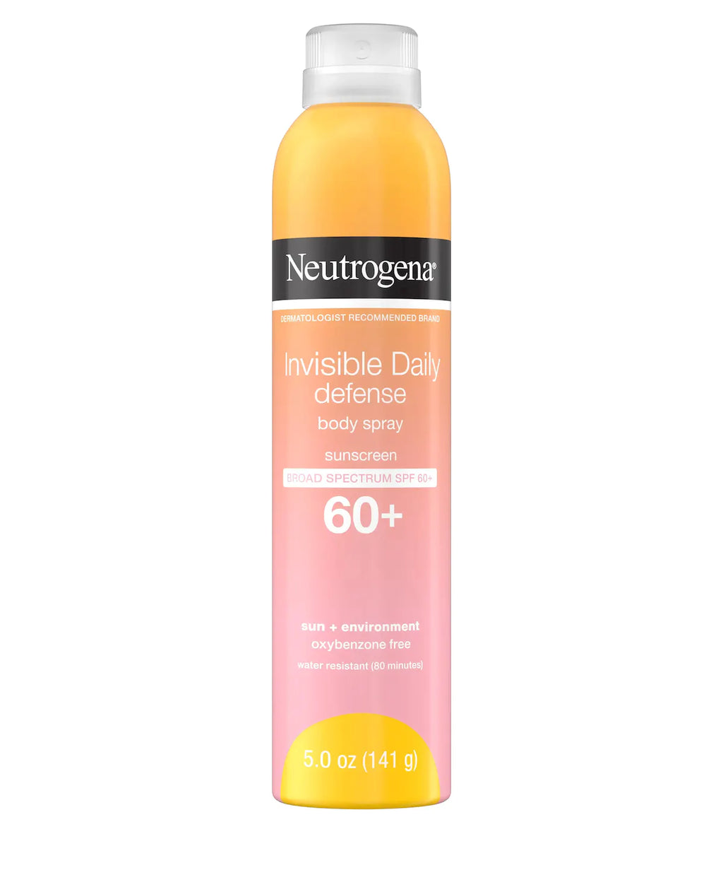 Protect skin against the sun and environmental aggressors with Neutrogena® Invisible Daily™ Defense Body Spray Sunscreen. With Helioplex® Technology, this broad spectrum SPF 60+ sunscreen spray helps prevent sunburn and fight signs of skin aging due to UV exposure. This lightweight, quick-drying formula also contains antioxidants to help fight environmental aggressors such as cold, ozone and pollution that can damage skin and lead to premature skin aging.