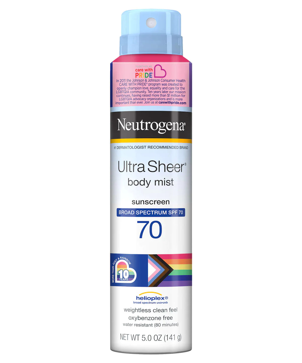 NEUTROGENA® ULTRA SHEER® Body Mist SPF 70 Sunscreen Spray provides powerful sun protection in a sheer, lightweight finish. Neutrogena® Ultra Sheer® Body Mist Sunscreen Spray with Broad Spectrum SPF 70 provides powerful sun protection that you will love to wear. Formulated with HELIOPLEX® technology, this non-greasy sunscreen provides superior UVA/UVB protection in a sheer, ultralight finish. Neutrogena® Ultra Sheer® Body Mist Sunscreen with Broad Spectrum SPF 70 is non-comedogenic and oil-free.